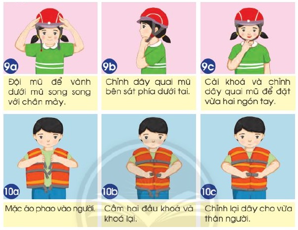 - Em cần đội mũ (nón) bảo hiểm và mặc áo phao đúng cách để giữ an toàn.